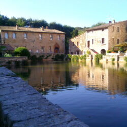 Bagno Vignoni è un piccolo borgo circondato dalle colline della Val d’Orcia, famoso per le acque utilizzate fin dall’epoca romana a scopi termali. Al centro si presenta la Piazza delle sorgenti, una vasca rettangolare che contiene una sorgente di acqua termale calda e fumante.