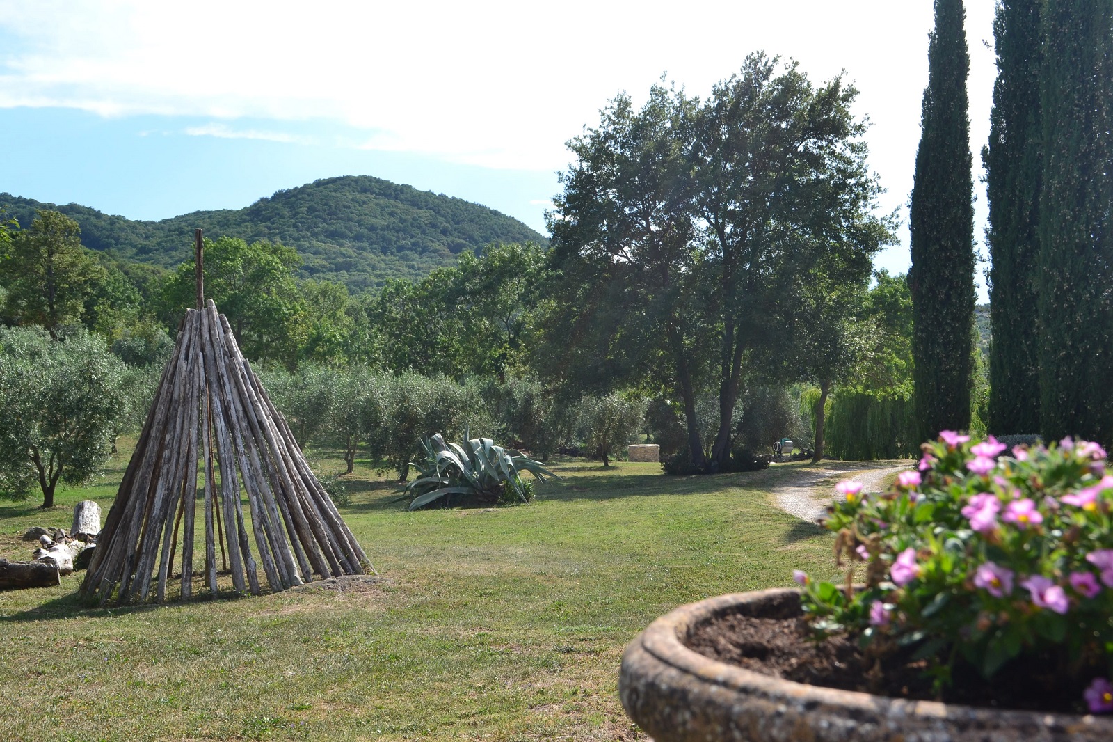 A holiday farm on the hills of Maremma with a large infinity pool and a garden with centuries-old oak trees.