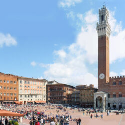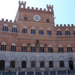 Siena is located in the heart of Tuscany and is surrounded by hills. It is one of the most important medieval cities in Italy. The focal point of the city is the famous Piazza del Campo, with its unusual shell shape, in which the famous Palio is held. The square is dominated by the red Palazzo Pubblico and its tower, called Torre del Mangia. The Palazzo Pubblico, like the Siena Cathedral, was built during the Government of the Nine, in the 13th century, the period of maximum economic and cultural splendour in the city.