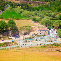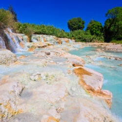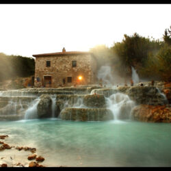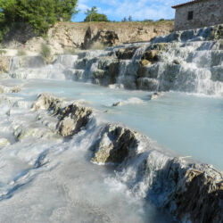 The Terme di Saturnia, a collection of thermal springs with sulphurous water, are located in the heart of the Tuscan Maremma area. The main free thermal waterfalls are Cascate del Mulino, also known as the Cascatelle di Saturnia, consisting of small pools of thermal sulphurous waters carved into the limestone rock.