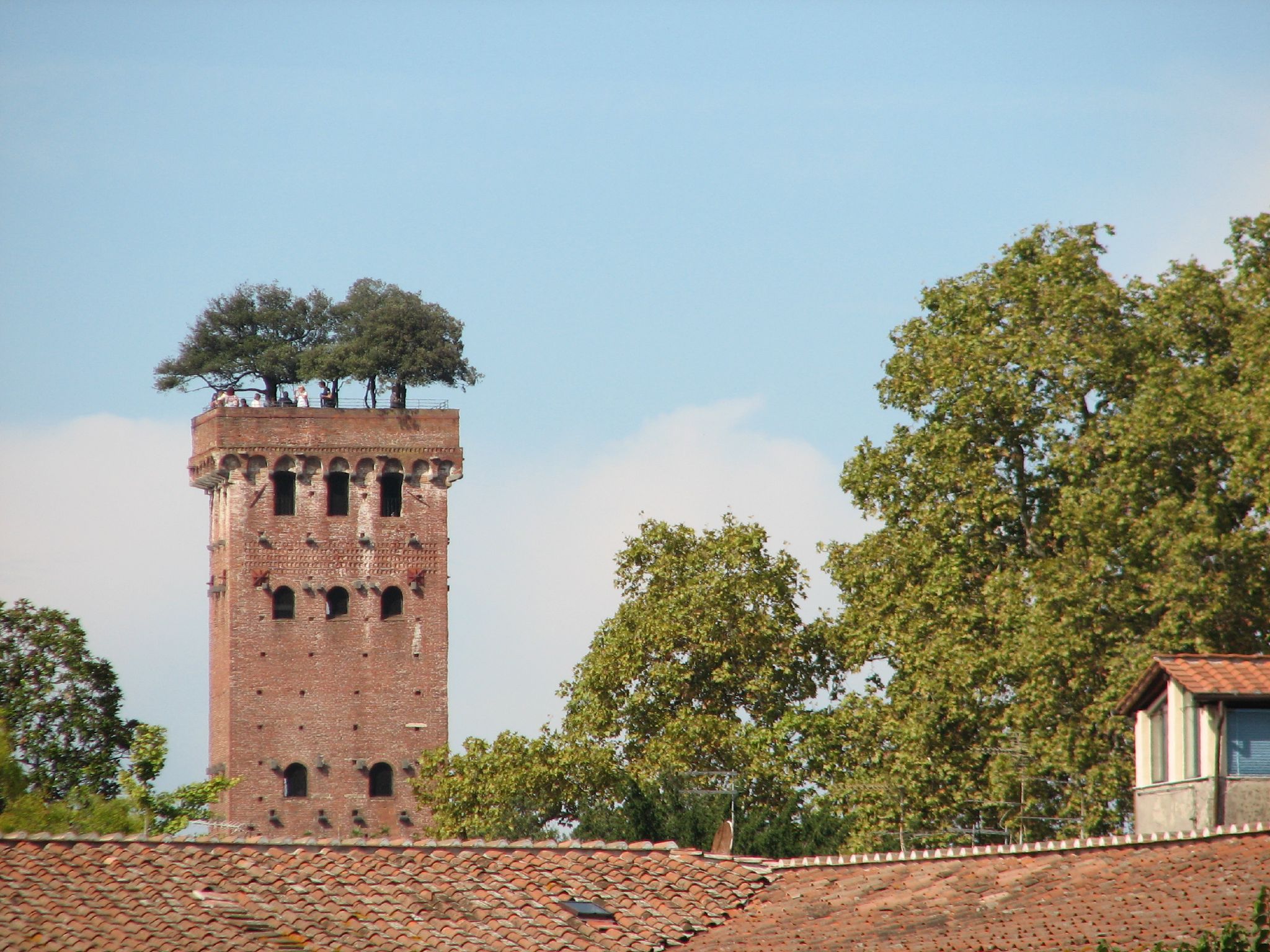 Built in the second half of the 14th century by the Guinigi family, the Tower is 45 metres high and is distinguished from all the buildings in the historic centre by the trees growing on its top. It is a typical example of Romanesque-Gothic architecture in Lucca, built in terracotta and adorned with three-mullioned windows, four-mullioned windows, coats of arms, cornices and plaques.
