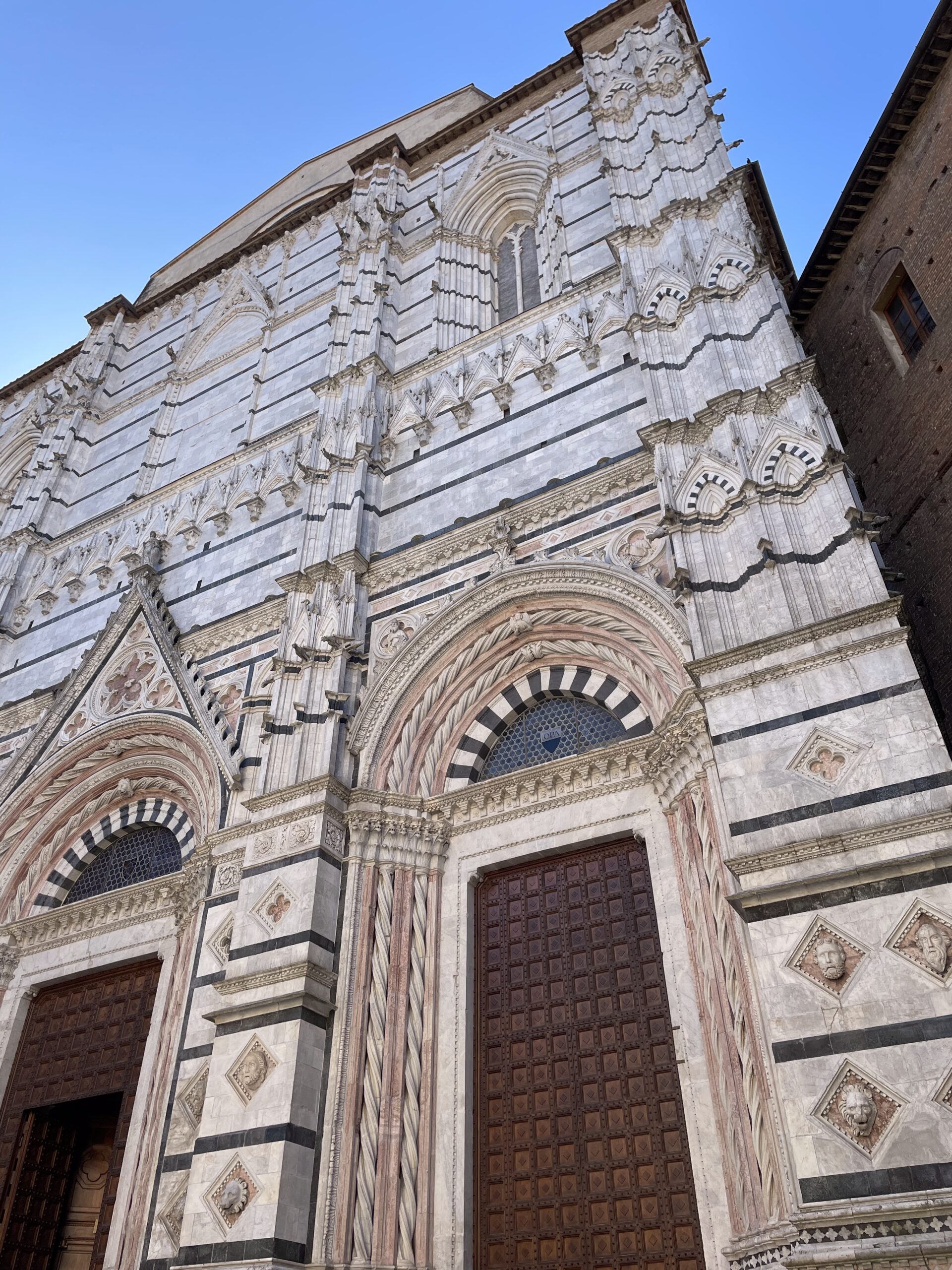 Il Battistero di San Giovanni fu eretto nel XIII secolo a ridosso della base dell’abside del Duomo di Siena. La facciata incompiuta è prevalentemente in marmo bianco e continua, verso l’alto, fino a coprire gran parte dell’abside del Duomo. L’opera più importante conservata all’interno è il celebre fonte battesimale realizzato da Jacopo della Quercia.