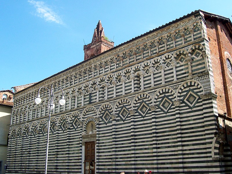 La Chiesa di San Giovanni Evangelista, detta San Giovanni Fuorcivitas è un importante complesso romanico. La chiesa all’epoca della sua fondazione longobarda, si trovava al di fuori della prima cerchia di mura cittadine, da qui l’appellativo di Fuorcivitas. La facciata è rivestita da linee verdi e bianche, in serpentino di Prato e marmo bianco e all’interno è custodita l’acquasantiera marmorea, realizzata in parte da Giovanni e Nicola Pisano. Molte le sculture e le pitture conservate di artisti del 1300.