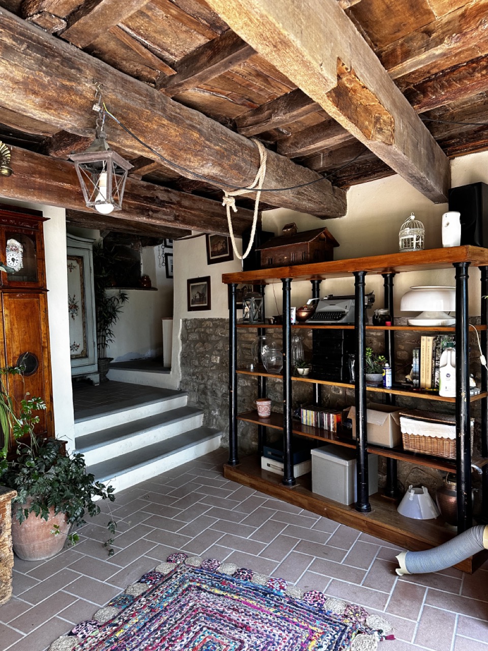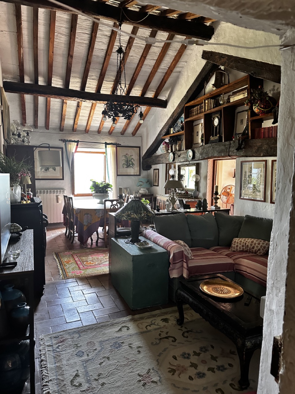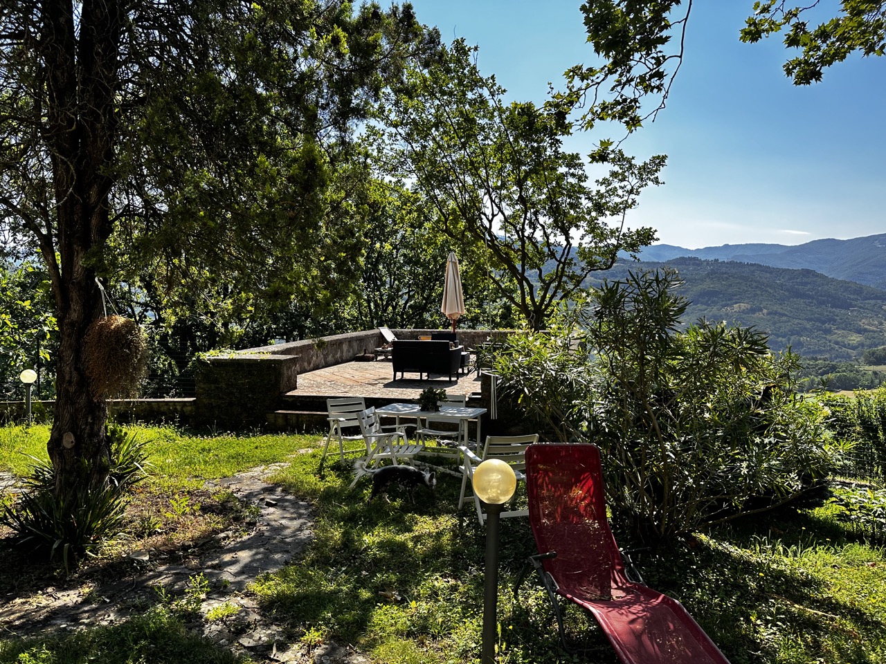 Vecchio casale contadino situato su un poggio, circondato da un grande giardino recintato con alberi.